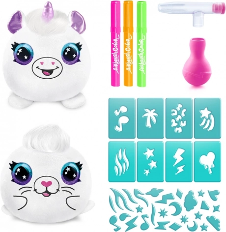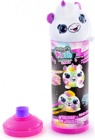Airbrush Kreativ-Set Neon Mini Überraschung ist ideal für kreativen Spaß. Im Inneren finden Sie Überraschungen in Form von Plüschtieren und Airbrush-Werkzeugen mit Filzstiften und Schablonen für eigenes Design.