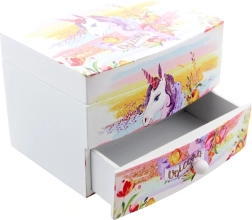 Holzschmuckkästchen mit Einhornmotiv, das nicht nur ein Designelement für das Kinderzimmer ist, sondern auch eine praktische Aufbewahrung für kleine Schätze. Es ist das perfekte Geschenk für Kinder, das mit seinem Zauber Freude bereitet.