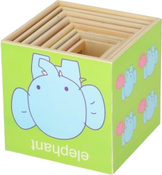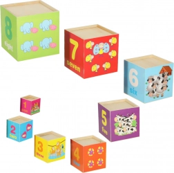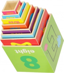 Kinder lernen Zahlen, zählen, grundlegende englische Wörter und erkennen beliebte Haustiere. Eine Seite des Würfels zeigt die Zahl und ihren englischen Namen, eine andere die entsprechende Anzahl an Tieren. Eine weitere Seite enthält ein Bild eines Tieres mit englischer Beschriftung. Es gibt auch Löcher zur Anpassung der Formen, was ein großartiges Training für Präzision und Hand-Auge-Koordination ist.