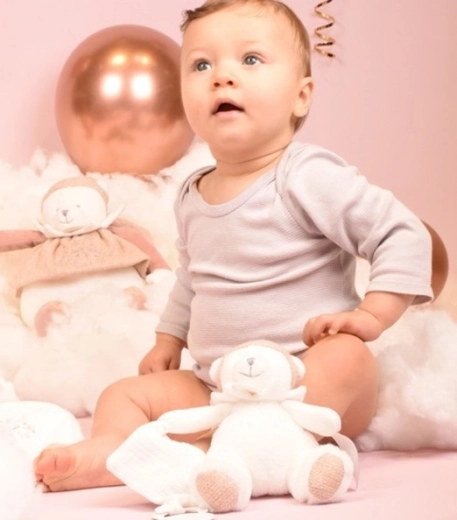 Der Plüsch Eisbär hat ein weiches rosa Mützchen, verziert mit Satinbändern, die liebevolle Botschaften auf Französisch tragen. Der Körper ist aus weichem Material mit feinster Doudou-Stickerei gefertigt. Der Bär bietet verschiedene Anreize zur Entwicklung der Sinne und Feinmotorik: