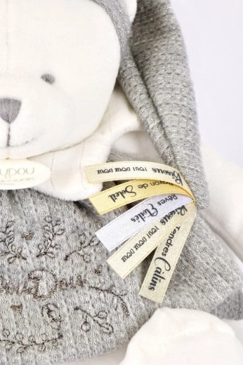 Doudou Plüsch-Eisbär ist das ideale Spielzeug für Neugeborene. Dank der grauen Mütze, die mit Satinbändern und liebevollen französischen Botschaften verziert ist, bietet der Bär bei jeder Kuscheleinheit eine sanfte Note.