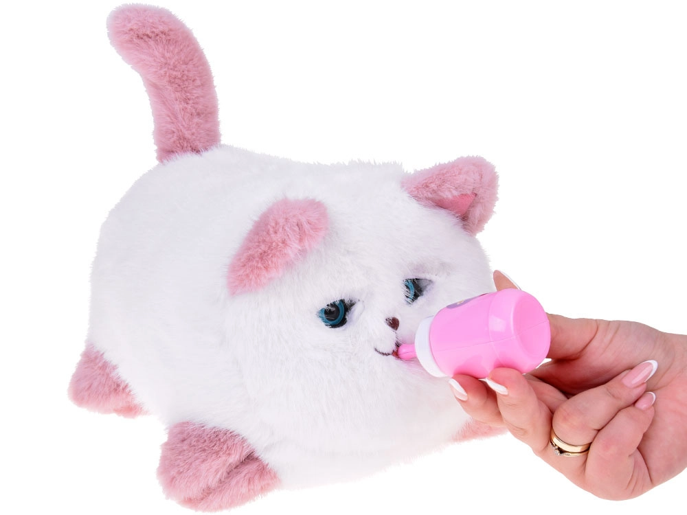 Im Paket finden Sie eine kleine Flasche, die Sie an den Mund der Katze anlegen können, um das Füttern mit Begleitgeräuschen zu simulieren. Die Katze Pusia nimmt auch Ihre Worte auf und spielt sie ab, wenn die Vorderpfote gedrückt wird.