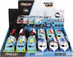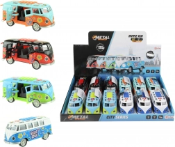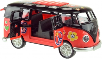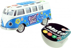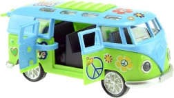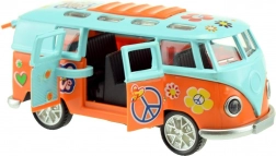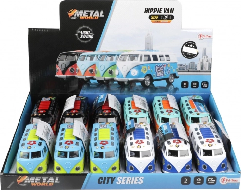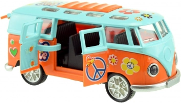 Entdecke den miniaturisierten Retro-Bus, der auf den ersten Blick mit seinem farbenfrohen „Hippie“-Stil begeistert und nach dem Start mit Effekten überrascht. Einfach nach hinten ziehen und loslassen – das Schwungrad sorgt für eine flotte Fahrt, während Lichter und Motorsound das Erlebnis unterstreichen.