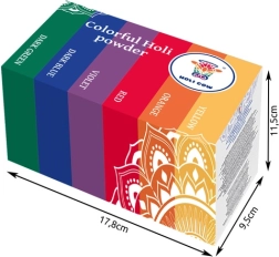 Im Paket finden Sie sechs kräftige Farbtöne: Weiß, Orange, Gelb, Grün, Blau und Violett. Das Set ist eine ausgezeichnete Wahl für das Holi-Fest, Mottopartys, Teambuildings und Promo-Events. Das Pulver ist auswaschbar und lässt sich leicht aus den meisten Textilien entfernen.