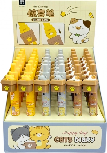Der Stift hat einen bequemen Griff, liegt gut in der Hand und schreibt flüssig, was die tägliche Anwendung zur Freude macht. Die größte Attraktion ist der Klickmechanismus – durch Drücken des oberen Teils des Stifts wird nicht nur die Mine herausgeschoben, sondern es klappt auch die Katze aus der Box. Diese unterhaltsame und funktionale Lösung macht jedes Schreiben zu einem Vergnügen. Interessante Muster und Pastellfarben machen den Stift zu einem tollen Geschenk oder Teil der Schulausstattung.