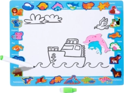 Auf der Rückseite des Brettes befindet sich eine trocken abwischbare Tafel mit den Maßen 30 x 22,5 cm, auf der das Kind mit dem mitgelieferten Stift eigene Zeichnungen erstellen kann. Es ist eine hervorragende Möglichkeit, die Vorstellungskraft zu entwickeln und die Feinmotorik zu üben.