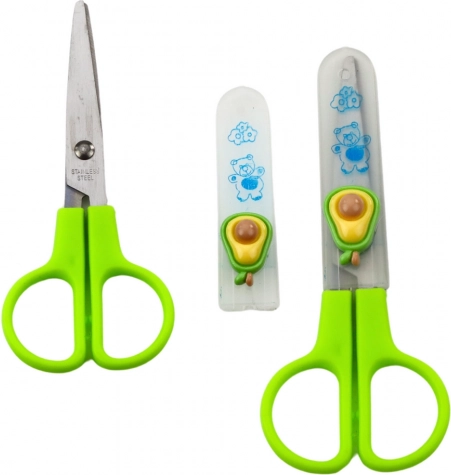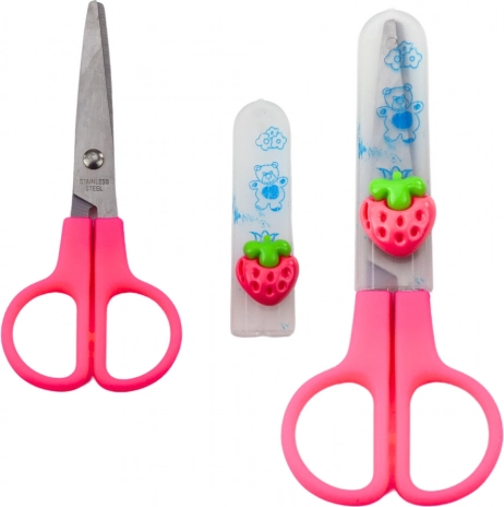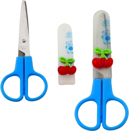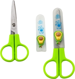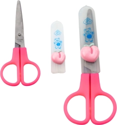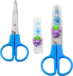 Die Schere hat abgerundete Spitzen und einen Schutzkappe für maximale Sicherheit bei der Verwendung durch Kinder.