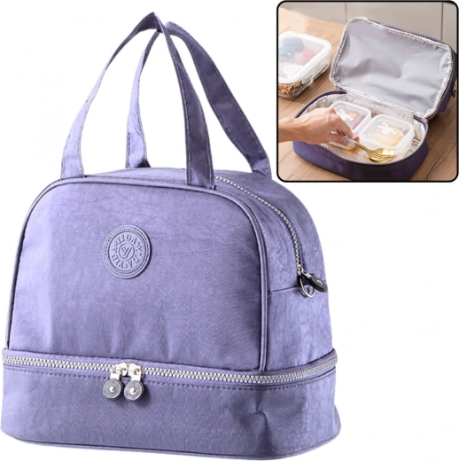 Dank der doppellagigen Konstruktion und der isolierten thermischen Schicht hält die Tasche die Temperatur der gelagerten Produkte effektiv, egal ob es sich um warme Speisen oder kalte Getränke und Snacks handelt. Das Hauptfach unten ist geräumig und fasst problemlos Lunchboxen, Obst, Getränke, Flaschen oder Thermobecher. Die obere Tasche ist für Kleinigkeiten wie Riegel, Joghurt, Servietten oder Besteck gedacht, was es ermöglicht, den Inhalt ordentlich und leicht zugänglich zu halten.