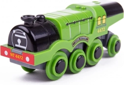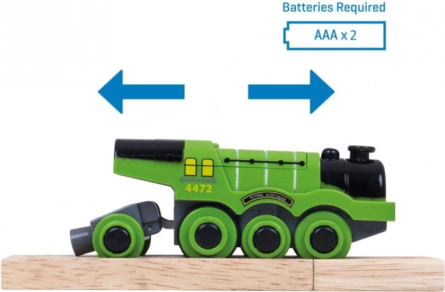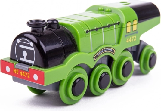 Diese elektrische Lokomotive, inspiriert von der legendären britischen Dampflok, ist für reibungslose Fahrten auf Holzschienen konzipiert. Sie wird über einen einzigen Knopf im Schornstein ein- und ausgeschaltet und zieht dank des starken Motors mehrere Waggons auch bergauf. Realistischer Sound und die grüne Ausführung begeistern kleine Eisenbahnfans.