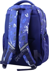 Der blaue Schulrucksack mit Dinosauriern und T-Rex-Aufnäher bietet zwei geräumige Fächer. Das Hauptfach hat ein Trennfach zur einfachen Organisation von Büchern, Heften und anderen Schulutensilien. Drei Fronttaschen mit Reißverschluss und elastische Seitentaschen bieten Platz für eine Flasche oder Bidon.