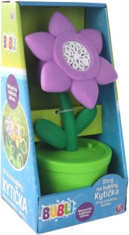 Erleben Sie Spaß mit der Seifenblasenmaschine in Form einer lila Blume, die eine große Menge an Seifenblasen auf einmal erzeugt und ideal für Kinderfeste oder Vergnügen im Garten ist.
