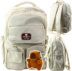 Das Aussehen des Rucksacks wird durch dekorative Pins mit Kapibara-Motiven und einen Plüschanhänger in Form einer Kapibara ergänzt, den das Kind nach eigenem Ermessen anbringen kann, um den Rucksack zu personalisieren.
