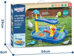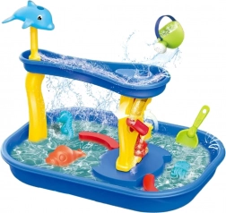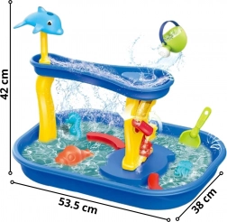 Wasserspielzeug 2-in-1 mit Wasserrad und Wasserrutsche – ideal für den Sommer! Schaffen Sie eine einzigartige Spielzone für Kinder im Garten oder zu Hause. Der spielerische, bunte Tisch kombiniert den Spaß am Fischen, dem Starten von Wasser und dem Beobachten des Wasserflusses durch lustige Konstruktionen wie ein Wasserrad oder eine Rutsche mit Delphin.