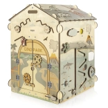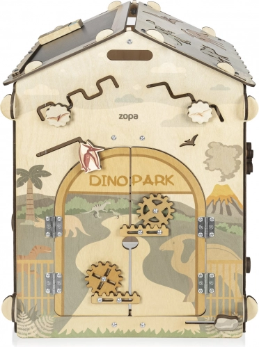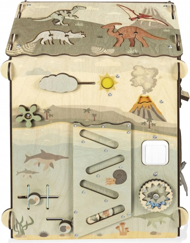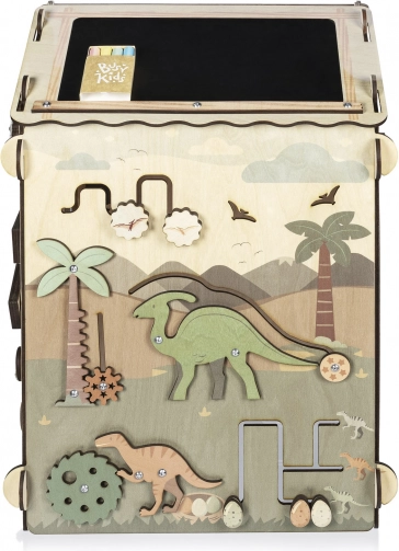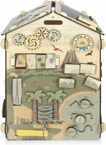 Das Dach dient als schwarze Kreidetafel, das 3D-Dinosaurierpuzzle unterstützt das räumliche Vorstellungsvermögen und die drehbaren Plättchen mit Spuren fördern Aufmerksamkeit und Logik. Praktische Elemente wie Reißverschlüsse, Schnürsenkel, Zahnräder und Labyrinthe helfen, Selbstständigkeit zu entwickeln.