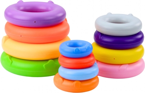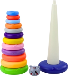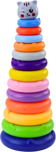 Dieses Spielzeug besteht aus einer breiten, stabilen Basis, einem hohen Stab und 13 bunten Ringen, die das Kind selbst stapelt und so einen beeindruckenden Turm erstellt. Oben befindet sich eine Figur einer süßen Katze, die das Kind zusätzlich zum Spielen ermutigt und ein attraktives visuelles Element bildet.