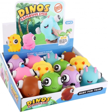 Unterhaltsames Dino-Spielzeug mit hervorstehenden Augen, ideal für Kinder. 6 Varianten verfügbar. Abmessungen: 7 x 6 x 7,5 cm.