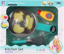 Set Inhalt: Pfanne, Ketchupflasche, Pfannenwender und drei imitierte Nahrungsmittel.