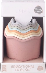 Genießen Sie den Spaß mit einem bunten Stapelturm aus Bechern, der jedes Kind unterhält. Die Packung enthält 8 Stück Becher mit Wellenmotiven, und der Turm erreicht eine Höhe von 40,8 cm.
