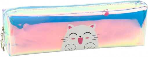 Das Schüleretui mit holografischem Effekt und dem Motiv eines niedlichen Kätzchens kombiniert modernen Stil mit kindlicher Verspieltheit. Die regenbogenfarbene, glänzende Oberfläche zieht die Aufmerksamkeit an und ergänzt perfekt die farbenfrohe Schulausrüstung.
