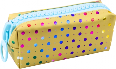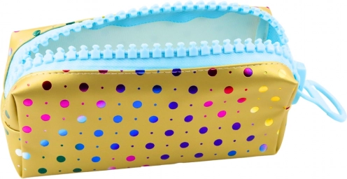 Schulmäppchen mit bunten Punkten und großem goldenen Reißverschluss
