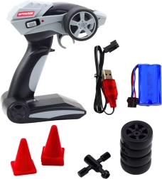 Das Auto ist mit LED-Leuchten (vorne, hinten, neongrün) ausgestattet, die ihm ein besonderes Aussehen verleihen, insbesondere bei Abendfahrten. Der fortschrittliche 2,4-GHz-Controller bietet präzise Steuerung und eine Reichweite von bis zu 25 Metern. Die Turbofunktion ermöglicht eine sofortige Geschwindigkeitserhöhung, während zusätzliche Reifen und Kegel es erlauben, eine eigene Strecke zu erstellen und Fahrtechniken zu perfektionieren.