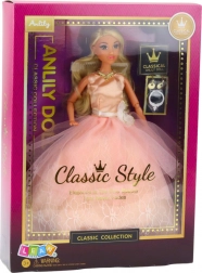 Die Anlily Puppe im puderfarbenen Abendkleid wirkt besonders dank des fächerförmigen dekorativen Saums und der Zierschleife. Sie hat lange blonde Haare, die gekämmt und gestylt werden können, und ihr zartes Make-up und die markanten Züge verleihen der Puppe ein warmes und elegantes Aussehen. Mit beweglichen Gliedmaßen - Armen, Beinen und Kopf, ist die Puppe ideal für dynamisches Spielen, Umkleiden und das Erfinden von Alltags- und Märchengeschichten.