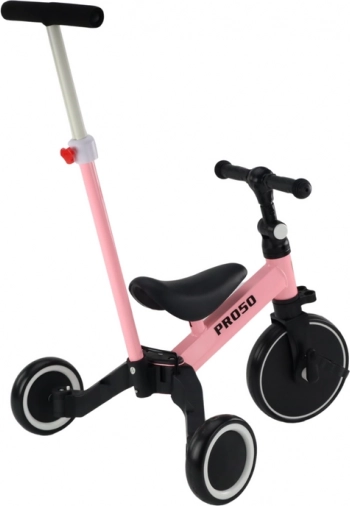 Das Modell PRO50 ist mit einem praktischen Führungshandgriff ausgestattet, der leicht entfernt werden kann, sobald das Kind selbstständig fahren kann. Das Design ermöglicht das Fahren auf auseinander- oder zusammengestellten Hinterrädern, was die Stabilität zu Beginn erhöht und einen reibungslosen Übergang zur klassischen Dreiradform ermöglicht.