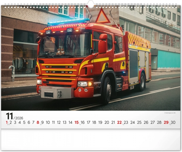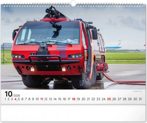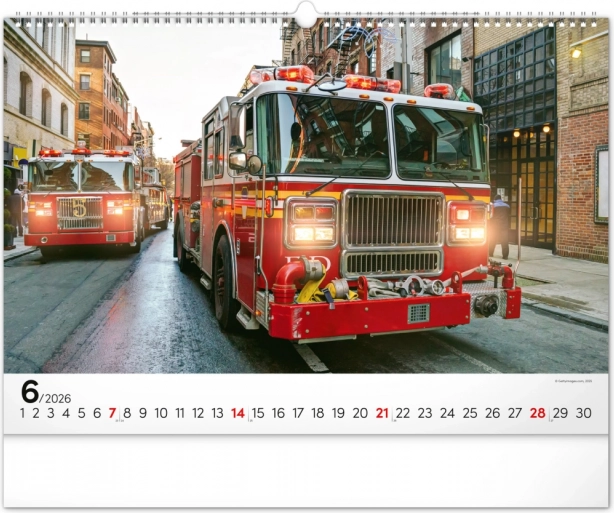 Jeder Monat des Kalenders zeigt einzigartige Fotos von Feuerwehrfahrzeugen, die durch ihre Dynamik und feurige Atmosphäre beeindrucken. Der Kalender hat ein universelles Kalendarium, das übersichtlich auf einem eleganten schwarzen Hintergrund platziert ist.