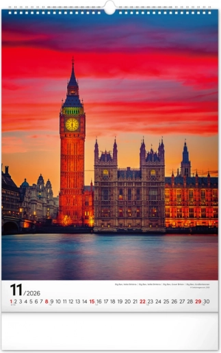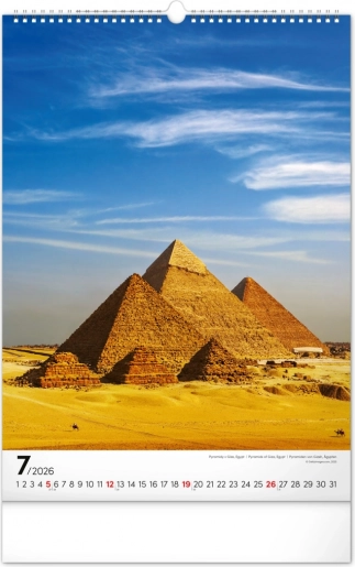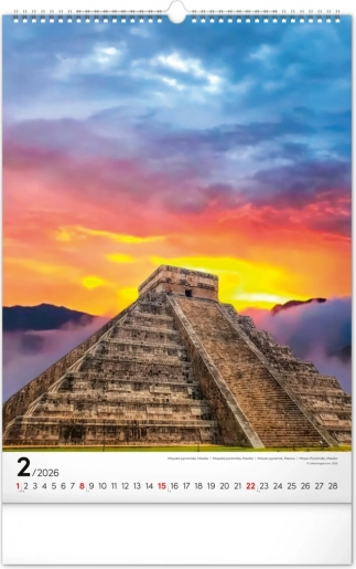 Dieser Wandkalender ist ideal für Liebhaber von Architektur und Reisen. Jeder Monat ist mit einer wunderschönen Darstellung von Weltmonumenten auf weißem Hintergrund verziert, was Klarheit und Übersichtlichkeit gewährleistet.