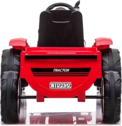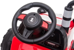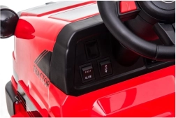 Der Traktor mit Anhänger besitzt alle charakteristischen Merkmale von Baufahrzeugen, einschließlich eines bequemen schwarzen Sitzes und eines Lenkrads mit Bedientasten und einem Musikpanel mit USB und Bluetooth. Die Konstruktion aus hochwertigem Material und die profilierte Bereifung ermöglichen das Fahren auf verschiedenen Oberflächen ohne Lärm.
