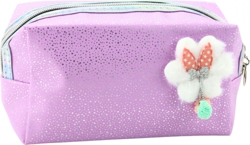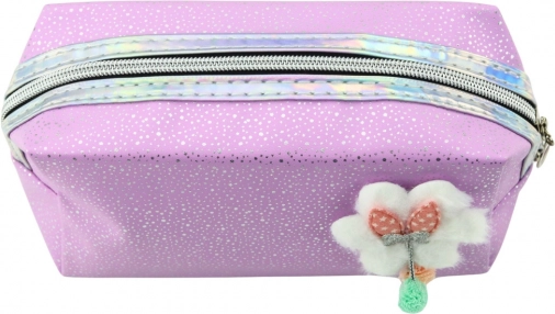Die stilvolle Kosmetiktasche ist ein einzigartiges Accessoire für die Schulausstattung oder den Alltag. Gefertigt in einem effektvollen Lilaton und verziert mit feinen, glitzernden Partikeln, zieht sie dank ihres auffälligen Designs alle Blicke auf sich. Auf der Vorderseite der Tasche befindet sich eine niedliche Applikation in Form einer flauschigen Wolke mit Schleife, an der zwei dekorative Kügelchen befestigt sind, die dem Ganzen einen besonderen Charme verleihen.
