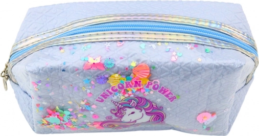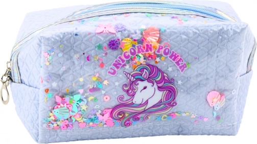 Schulmäppchen mit Einhorn und Konfetti in Blau für Kinder, ideal für Schulbedarf und Kleinigkeiten.