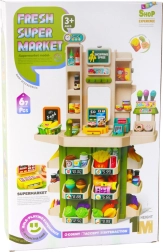 Interaktiver Frische-Supermarkt ist ein modernes, lehrreiches Spielzeug, das das Kinderzimmer in einen realistischen Supermarkt verwandelt. Es enthält 67 Elemente, darunter Lebensmittel-Imitate, einen Preisscanner und eine Kasse.