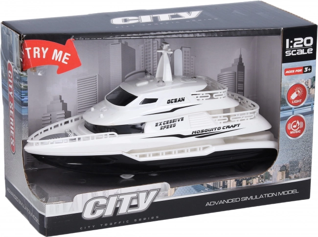 Dieses weiße Trägheitsbetriebenes Boot besticht nicht nur durch sein elegantes Design, sondern auch durch interaktive Effekte, die es attraktiv für Kinder machen. Es bietet Stunden voller Spaß bei der Simulation einer Schifffahrt.