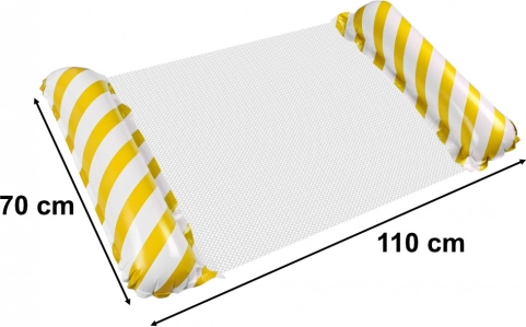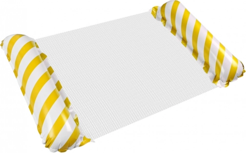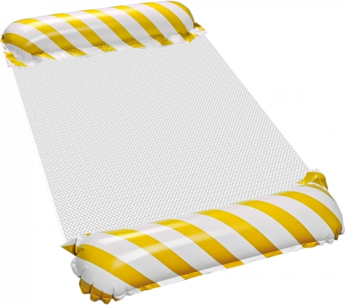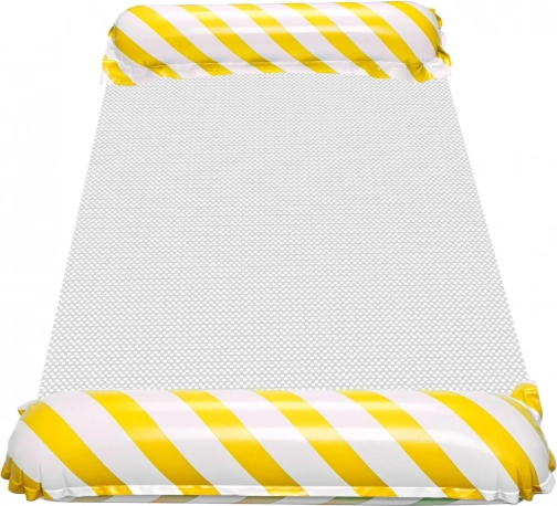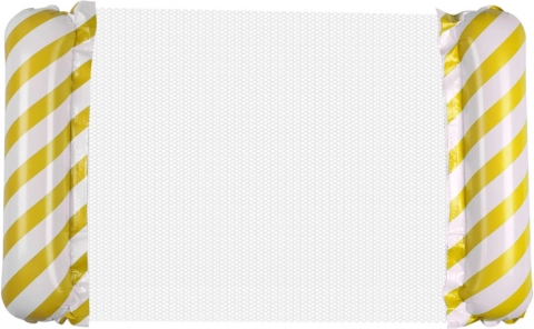 Genießen Sie eine Pause am Strand oder Pool mit dieser gelb-weißen Matratze. Aufblasbare Seiten sorgen für Balance, während das starke Netz Ihren Körper über Wasser hält. Es ist so konzipiert, dass es sowohl für das Liegen als auch das Sitzen auf ruhigem Wasser Komfort bietet.