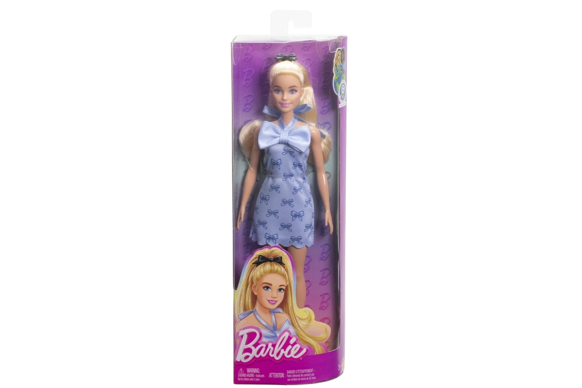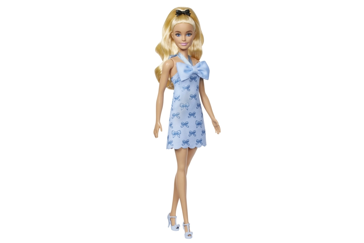 Dieses moderne Barbie Model strahlt in einem hellblauen Kleid mit Schleifenprint und einer markanten Schleife am Ausschnitt. Langes blondes Haar mit eleganter schwarzer Schleife und passende Schuhe verleihen der Puppe einen ikonischen Look, den man sofort liebt. Dank der beweglichen Gelenke nimmt sie leicht natürliche Posen ein, was die Fantasie anregt und die Feinmotorik fördert.