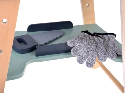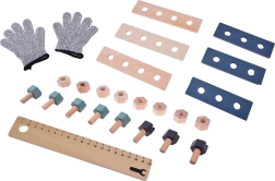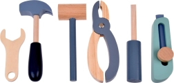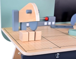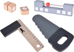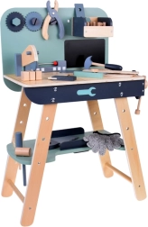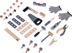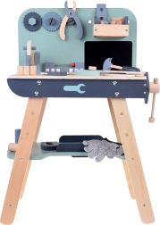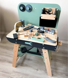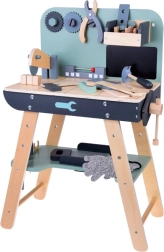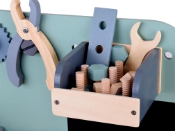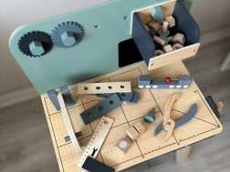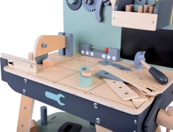 Das Set besteht aus robustem Holz und enthält Werkzeuge wie Hämmer, Schlüssel, Schraubenzieher und mehr. Alle Teile sind sicher, abgerundet und mit viel Liebe zum Detail gefertigt. Der Werkstattbereich ist zusätzlich mit einer kleinen Kreidetafel zur Planung von Projekten ausgestattet.
