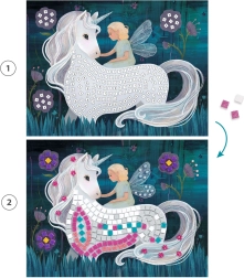Entdecken Sie kreativen Spaß mit dem Set Djeco Mosaik Magische Welt. Kinder platzieren nach Zahlen ganz leicht selbstklebende glitzernde Quadrate und dekorative Steinchen auf die vorbereiteten Unterlagen, wodurch wunderschön strahlende Bilder entstehen. Das Set ist perfekt für den Einstieg in die Mosaikgestaltung – es benötigt weder Kleber noch Schere.