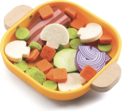 Das Djeco Cook & Scratch Set für Kinder wurde entwickelt, um das Rollenspiel des Kochens und die Entwicklung kulinarischer Fähigkeiten bei kleinen Kindern zu unterstützen. Das Set enthält eine Holzpfanne mit einer Innenseite, die mit Klettverschluss ausgestattet ist, wodurch die beiliegenden Holzlebensmittel befestigt werden können. Dadurch erlernen Kinder grundlegende Kochfähigkeiten und können Erwachsene beim Kochen nachahmen.