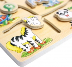 Das Bewegen der Teile entlang der Bahnen und das richtige Zuordnen der Köpfe zu den Tierkörpern stärken die Hand-Auge-Koordination, Geduld und Konzentration der Kinder.