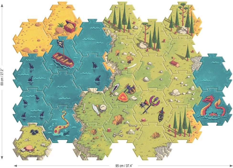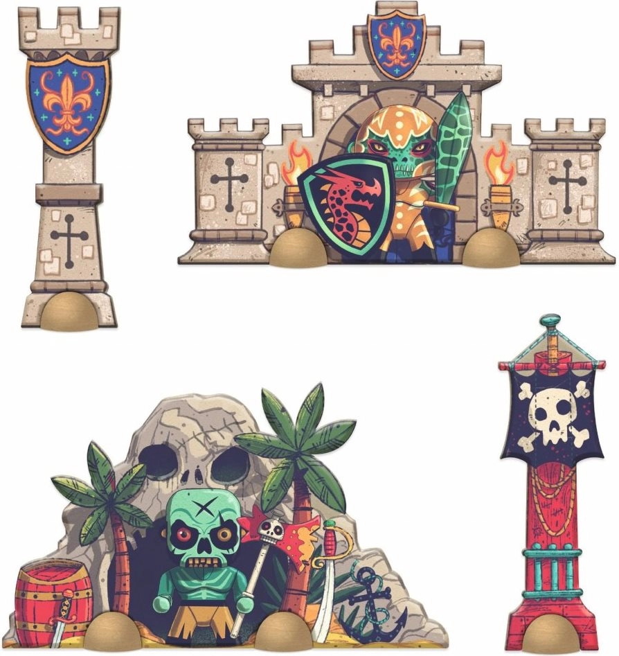 Dieses originelle Set verbindet Puzzlefreude mit kreativem Spiel. 26 große sechseckige Teile ermöglichen eine weitläufige Szene, während 4 vertikale Kulissen auf Holzsockeln dem ganzen Schlachtfeld einen räumlichen Effekt verleihen. Die Teile bestehen aus sehr festem Karton mit FSC®-Zertifizierung und halten auch häufigem Spielen stand.