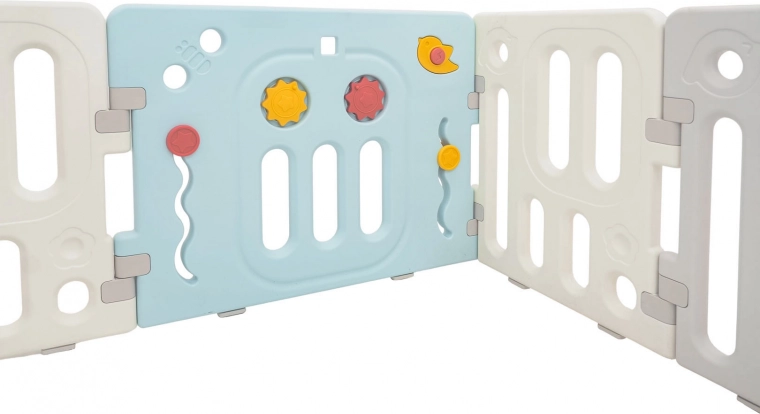 Das Set enthält insgesamt 10 Paneele zur Erstellung eines stabilen Schutzgitters. Das Gitter hat eine Blockierung der Tür von außen, um ein selbstständiges Öffnen durch das Kind zu verhindern. Rutschfeste Füße sorgen zusätzlich für die Stabilität des Schutzgitters und verhindern dessen Verschiebung.