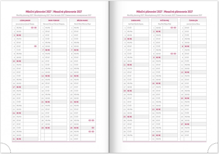 Dieser exklusive Planer bietet eine breite Palette von Sprachen, darunter Tschechisch, Slowakisch, Englisch, Deutsch, Ungarisch und Russisch, was seine Nutzung für ein breites Spektrum von Nutzern ermöglicht. Aprint 2026 enthält: