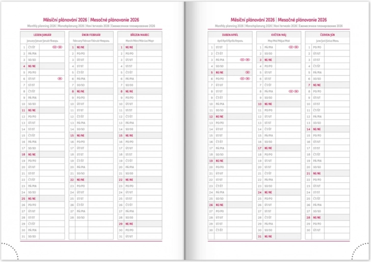 Tageskalender ist unter Berücksichtigung Ihrer Bedürfnisse für effektive Organisation entworfen. Enthält ein tschechisch-slowakisches Kalendarium mit zusätzlichen Sprachen wie Englisch, Deutsch, Ungarisch und Russisch.