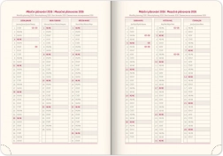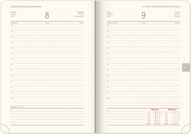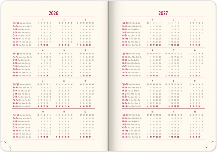 Der Kalender enthält einen Tagesplan mit einem tschechisch-slowakischen Kalender und ergänzenden Sprachen, darunter Englisch, Deutsch, Ungarisch und Russisch.