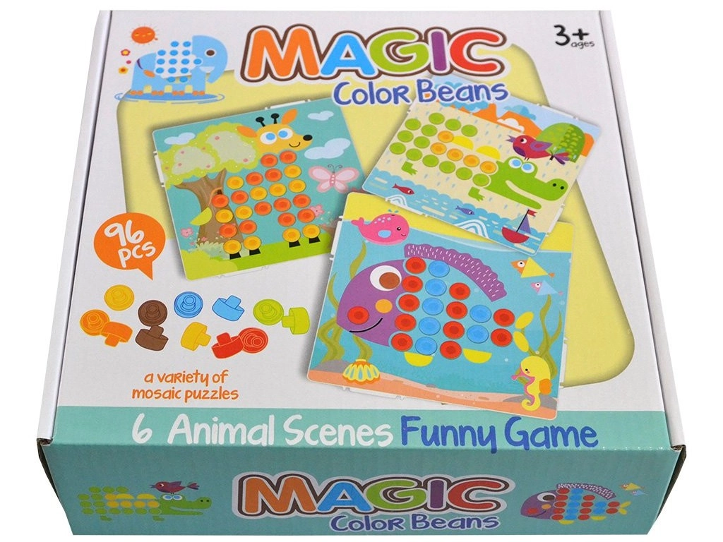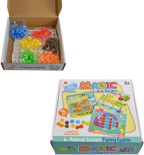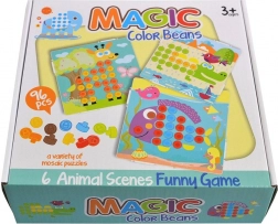 Mosaik mit farbigen Vorlagen ideal für kreative Kinder. Enthält 6 verschiedene Umgebungen, in denen Tiere leben. Kinder können den Körper der Tiere mit farbenfrohen Hütchen ergänzen.