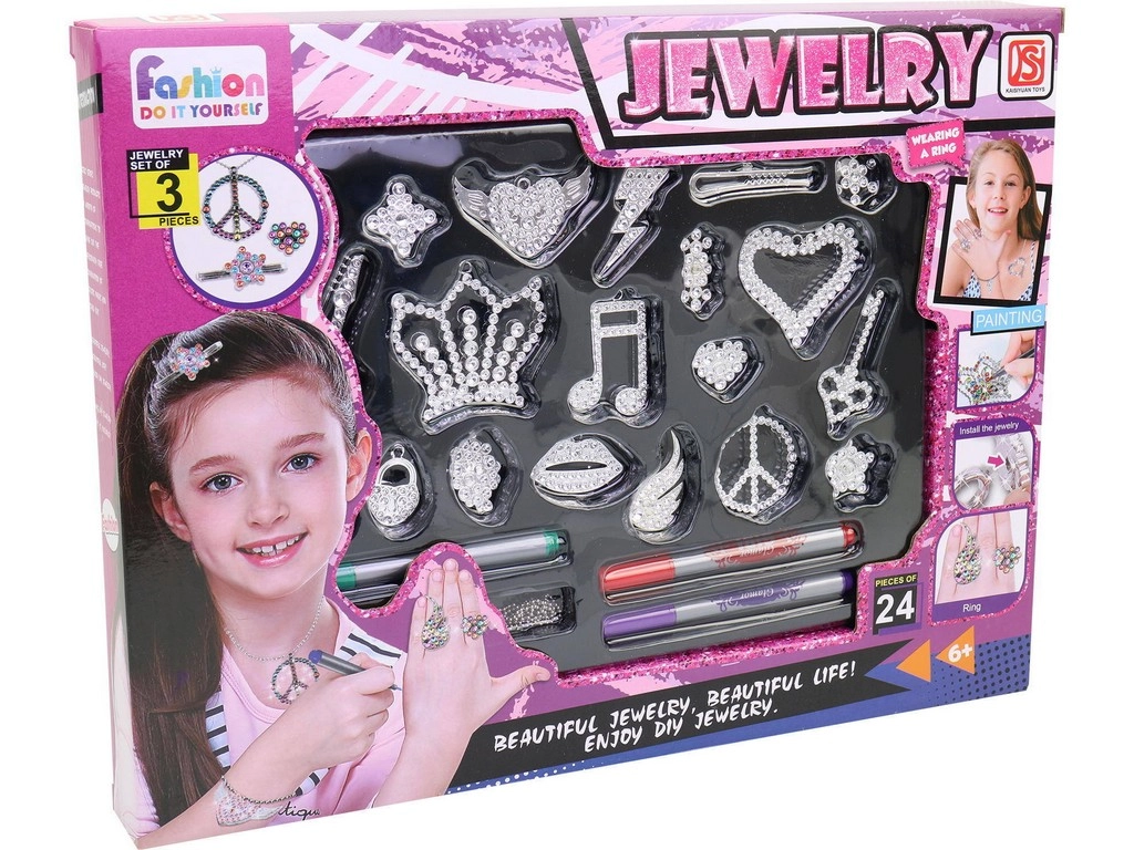Fördern Sie die Kreativität und Feinmotorik Ihrer Kinder mit dem Schmuck-Malset. Dieses Spielzeug wurde entwickelt, um stundenlangen Spaß zu bieten, während die Kinder ihre eigenen einzigartigen Schmuckstücke kreieren können. Es enthält verschiedene Elemente, die leicht bemalt und personalisiert werden können: