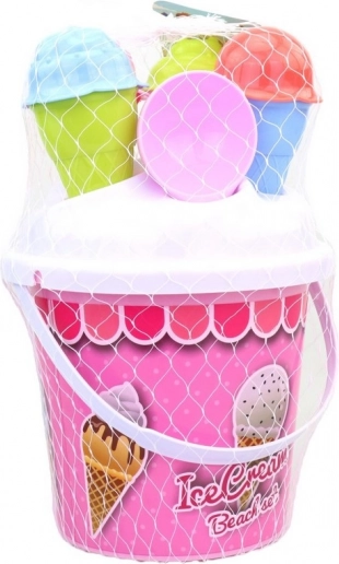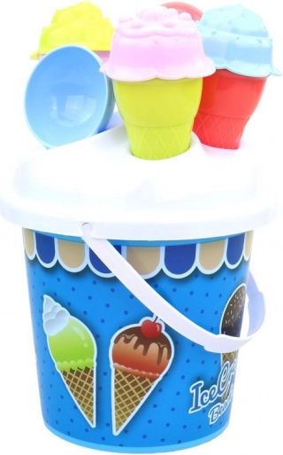 Zum Set gehört ein Eimer mit Griff für einfache Handhabung und Transport am Strand oder Sandkasten. Der Eimer ist mit effektvollen Eiscreme-Grafiken verziert.