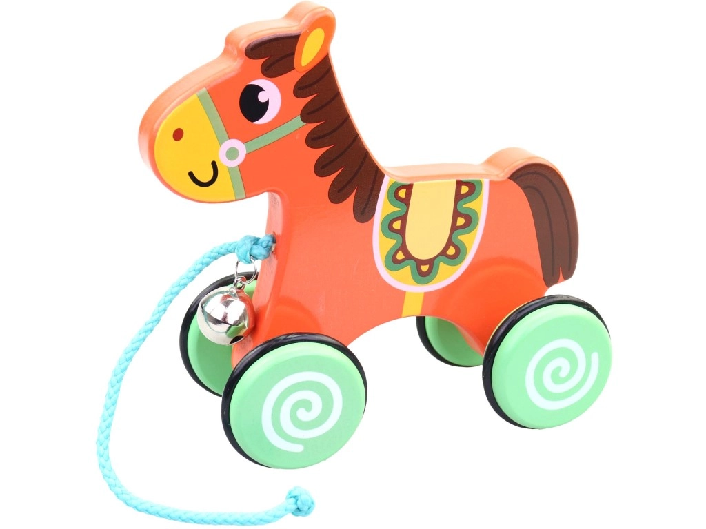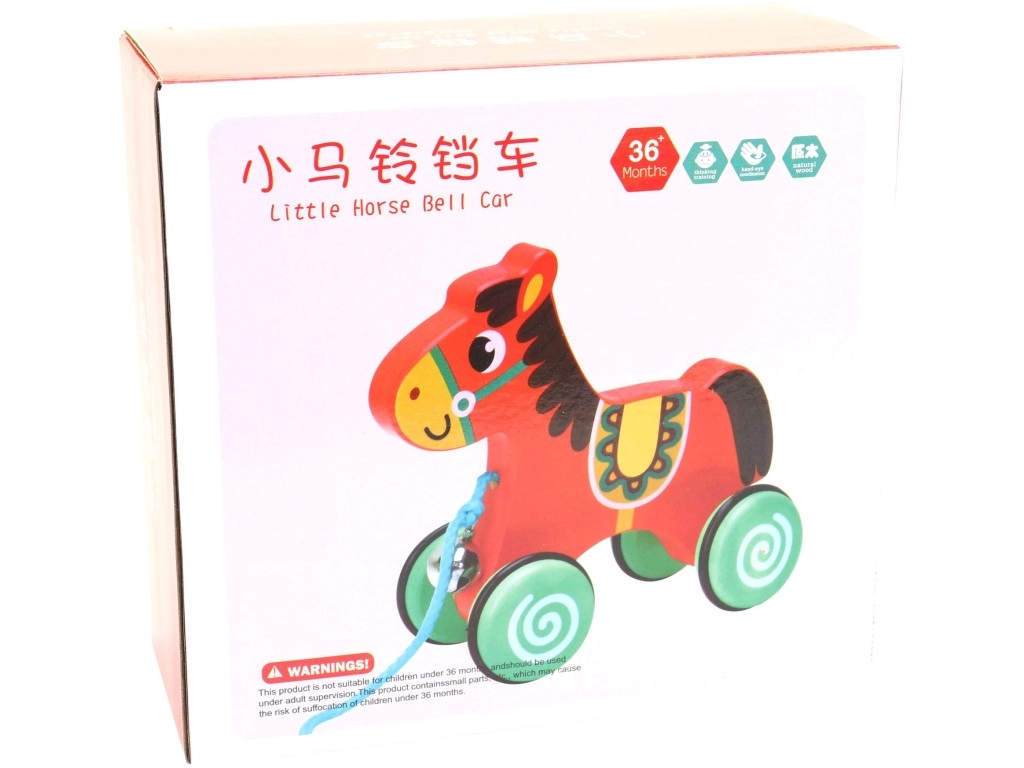 Dieses hölzerne Ziehspielzeug in Form eines Pferdes bietet nicht nur Spaß, sondern stimuliert auch die Sinne dank des Glöckchens, das beim Bewegen einen sanften klingenden Ton abgibt. Es besteht aus hochwertigem Holz und hat eine Größe von 16 cm, was es leicht handhabbar für kleine Kinderhände macht.