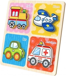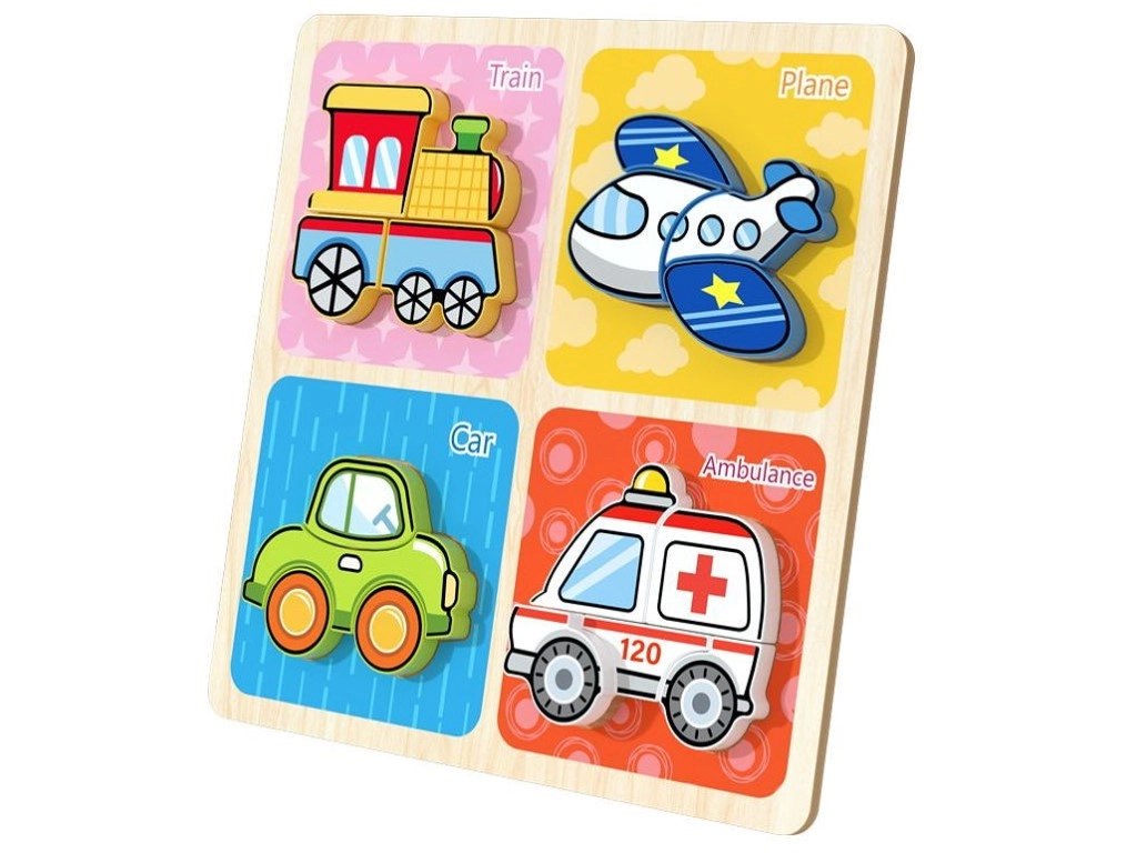Das Holzpuzzle mit den Maßen 30 x 30 cm ist mit Bildern von vier verschiedenen Verkehrsfahrzeugen ausgestattet, die dem Spiel Attraktivität und einen pädagogischen Wert verleihen. Die Kinder spielen nicht nur mit diesen Puzzlen, sondern üben auch ihre Feinmotorik und logisches Denken, was ideal für Kinder ab 3 Jahren ist.